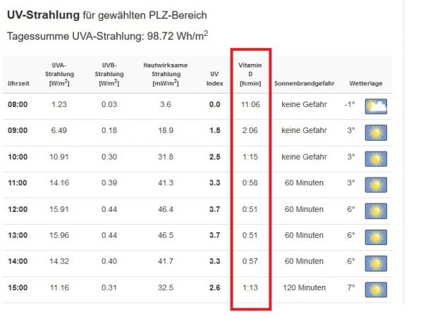 In der Spalte daneben kann abgelesen werden, wie viele Stunden und Minuten Sie sich theoretisch um diese Uhrzeit in der Sonne aufhalten müssten, um Ihren optimalen Gehalt an Vitamin D zu erreichen (wenn sich UV-Strahlung und Bewölkungsgrad nicht ändern würden).