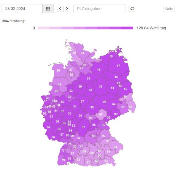 Hier lässt sich nicht nur ablesen, wie viel UVA- und UVB-Strahlung die Erdoberfläche in diesem PLZ-Bereich erreicht. Alles rund um die Messungen der UV-Strahlung und der Unterscheidung von UVA und UVB-Strahlung lesen sie hier.