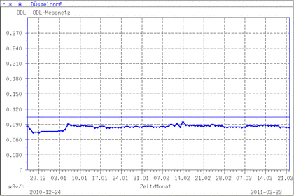 Aktuell liegt die Radioaktivität in Deutschland im normalen, natürlichen Bereich. Diese Grafik des Bundesamtes für Strahlenschutz zeigt die Messwerte in Düsseldorf seit Ende Dezember:
