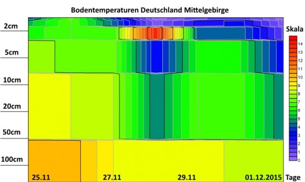 Bodentemperatruen vom 25.11.2015 bis zum 01.12.2015 für das Mittelgebirge.