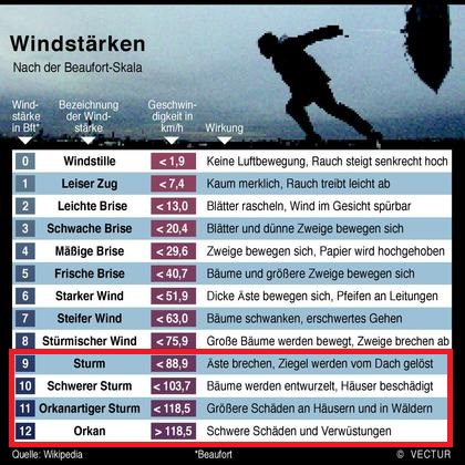 Bezeichnung für Wind mit großer Heftigkeit, nach der Beaufort-Skala der Stärke 9 bis 11 (74 bis 117 Stundenkilometer), der erhebliche Schäden und Zerstörungen anrichten kann. Normalerweise treten Stürme eher selten im Binnenland auf.