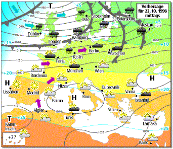 Auf einer Wetterkarte werden zunächst die Linien gleichen Luftdrucks, die Isobaren eingezeichnet. So erhält der Meteorologe einen Überblick über die Verteilung von hohem und tiefem Luftdruck. Mit Hilfe der Wettermeldungen vieler Wetterstationen werden noch Wetterfronten eingezeichnet. So kann auch der Laie sehr schnell erkennen, wo Gebiete schlechten und schönen Wetters zu finden sind.