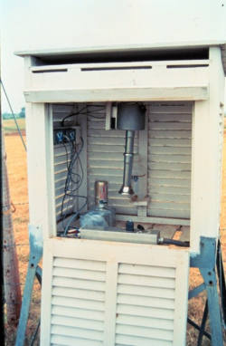 Bild: Solarbetriebene Wetterstation des amerikanischen Wetterdienstes. Am Mast werden Windrichtung und -geschwindigkeit gemessen, im weißen Kasten Temperatur, Luftfeuchtigkeit und Luftdruck. Der Regenmesser steht links des Masts. NOAA Photo Library.