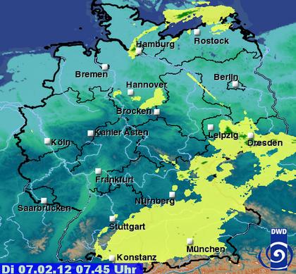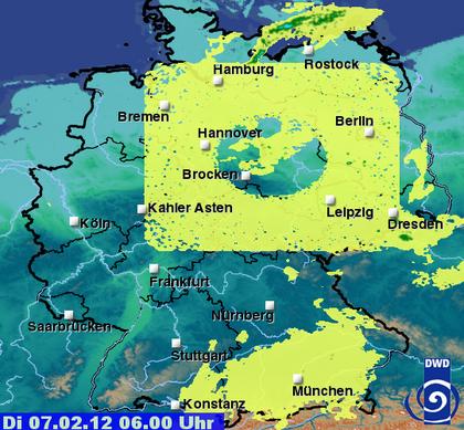 Verlängert man die Linie, die nach unten sogar noch etwas spitz zusammenläuft, dann sieht man, dass diese Linie auf Dresden zeigt. Der Standort einer Radarstation. In diesem Fall wurde der Strahl des Dresdner Radars offenbar durch irgendein Objekt nordwestlich von Dresden kurzzeitig reflektiert. Und zwar so, dass die Auswertung dies als Echo über größere Entfernungen interpretiert hat. Auch hier also keine künstlichen Wolken, kein Angriff der Klonkrieger, sondern schlicht die Grenzen der Messtechnik.