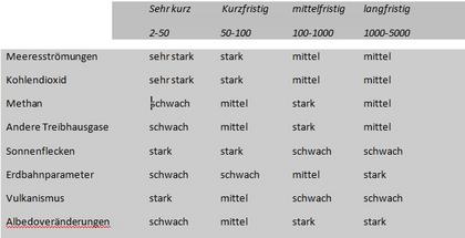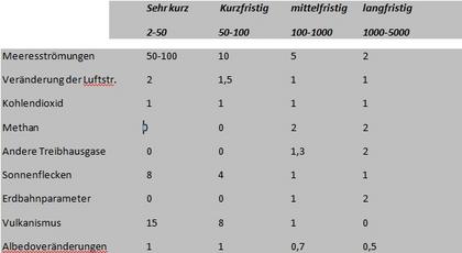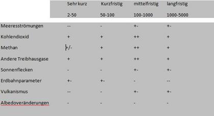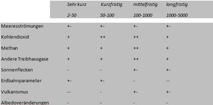 Tab.: Faktoren (Auswahl) die unser Klima weltweit bestimmen (Zeitskala in Jahren)