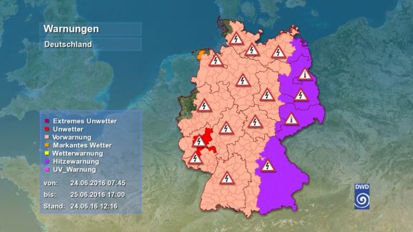 Inzwischen hat sich die Lage mancherorts etwas entspannt. Dennoch gelten nach wie vor zwischen den Küsten und den Alpen amtliche Warnungen und Vorwarnungen des Deutschen Wetterdienstes vor schweren Gewittern. In der Region Mainz, Hunsrück, Koblenz und Westerwald besteht aktuell eine Unwetterwarnung. Hier ist mit schweren Gewittern mit heftigem Starkregen, Orkanböen und Hagel zu rechnen.