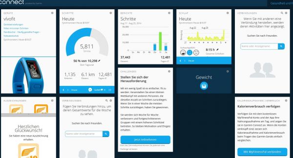 Die PC- und Smartphone-Synchronisation mit spezieller APP klappt auch mit dem VIVOFIT ohne jegliche Schwierigkeiten. Das Dashboard (s. Bild) ist wie bei den anderen Produkten übersichtlich und selbsterklärend gestaltet. Positiv aufgefallen ist uns zudem die Kompatiblität mit anderen Garmin-Produkten. So kann das VIVOFIT etwa noch mit einer GPS-Uhr oder einem Brustgurt erweitert werden.
